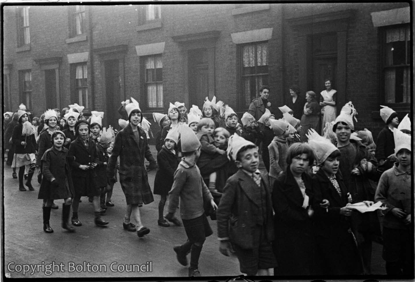 On this day 75 years ago it was the municipal elections in Bolton. Mass Observation was involved with the Labour party campaign through observer Walter Hood, a staunch trade unionist. He can be seen in the back of this photograph of children who are marching in an election rally wearing paper hats. The leader of the Worktown study, Tom Harrisson was fascinated by this ritual. He saw parallels between it and the behaviour of the cannibal tribes he had studied in Borneo. I photographed the general election in Bolton in 2010 and came across hundreds of children with balloons which had been handed out by the Conservative and Labour party- blue and red respectively of course! A Labour party worker told me that they competed to make sure that more of their colour balloons had been handed out. It seems like the old ritual habits of us Northern cannibals are ingrained.