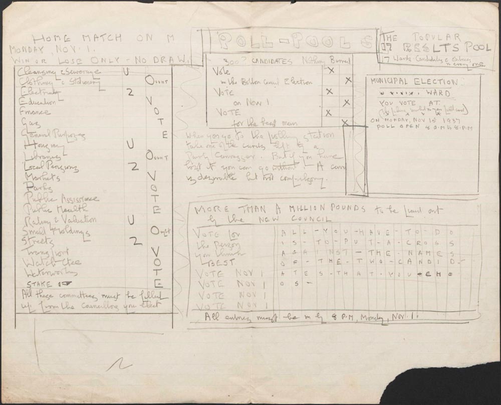Mass Observation was interested in non-voters too. One of their main missions was to find out about the people who were ignored by the press and government. Tom Harrisson came up with the idea of political pool polls and this is a rough design of the idea. He reasoned that if people could fill out a complex pool coupon each week then they were more than capable of voting. It was just a case of making them feel that they could actually win something useful in the political pools. This document is in the Mass Observation Archive at the University of Sussex. We have recently added some documents from the archive to this site thanks to them and Adam Matthew publications. We have chosen documents, like this, which help the photographs to tell stories.