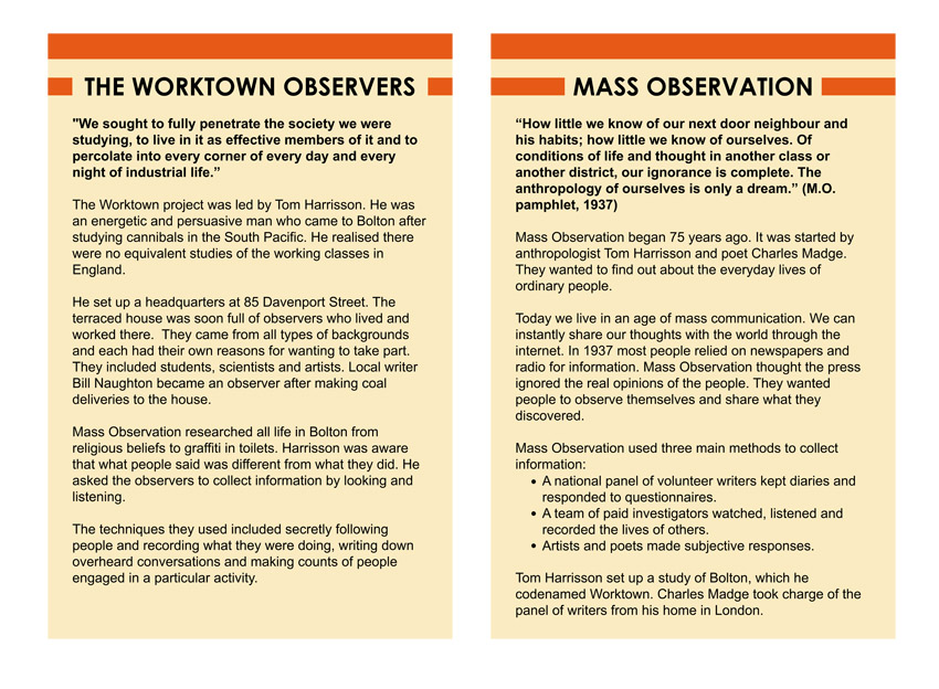 If you’ve been to the Worktown 75th Birthday exhibition at Bolton Museum as well as visiting this site then perhaps you have noticed a design connection between them. Our web designer Perry was inspired by the iconic orange and cream design of the Penguin ‘Specials’ paperbacks and we continued the theme for the exhibition display panels.