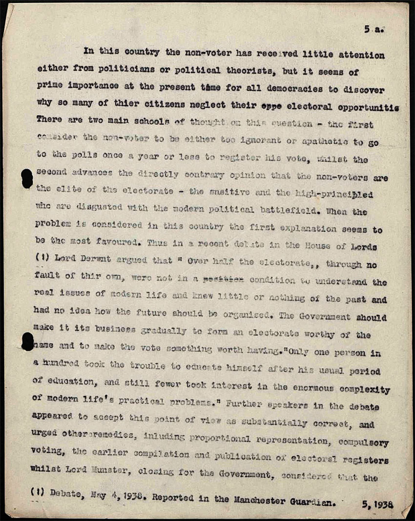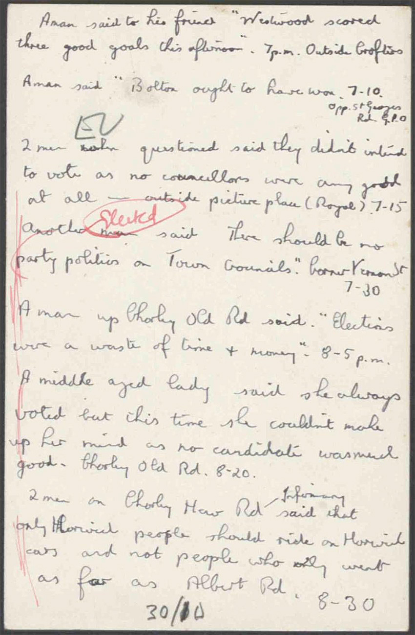 These extracts are taken from Mass Observation’s study of the non-voter in Bolton which was brought to mind by the extraordinarily low turnouts for this week’s police commissioner elections. The first extract is taken from a draft written by Tom Harrisson for a book on voting which was never completed. It’s interesting how the same debates go round and round- whether non-voting is a sign of apathy or protest. Harrisson’s conclusion in 1938 was that the non-voter was typically presented as ignorant and unwilling to participate responsibly in the democratic process.