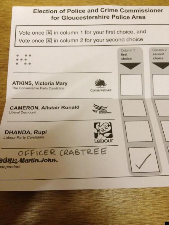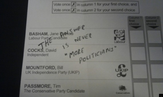 MO struggled to find statistics from previous elections to inform their research and were breaking new ground in considering the non-voter. Today we are able to instantly access voting figures although there don’t seem to be many figures on spoilt ballot papers other than for the first candidate elected. Conservative Angus Macpherson became the first police commissioner elected with a turnout of 15.3% in Wiltshire. Spoilt ballots made up 3.3% of the total vote showing that a significant number of people cared enough to go and vote but did not agree with the election.